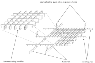 The material consists of aluminium alloy AIMn 1 Mg 0.5 to DIN 1725. Behaviour in fire Non-combustible construction materials, Class A in compliance with DIN 4102 (A 1, A 2). Coating The visible face of the strips is tove-enamelled and is avaiable in all RAL colours. The polyester paint has a thickness of 20 mµ, is corrision-resistant, light-fast, abrasion-resistant, frost-resistant, water repellent, odour-free and electrostatically non chargeable. All strips are coated with a transparent protective paint with a thickness of 5 mµ on the rear side. Mechanical construction The mechanical construction is designed to allow the elements to intermesh. The cross rails are suspended in the mounting rails and the louvered ceiling elements are then inserted in the resultant frames. Standard sizes 600 x 600 mm 625 x 625 mm '625 x 1,250 mm 600 x 1,200 mm Profile width: 12-15 mm Material thickness: 0.5 mm Profile heights: 40, 50, 60 mm Standard grid dimensions 50, 60, 62.5, 75, 86, 100, 120, 125, 150, 200, 300 mm |